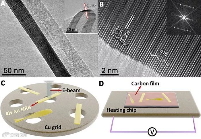 图1. 超细4H金纳米带的几何形貌以及原位电镜下E-Beam和MEMS芯片的两种加热模式。图片来源:Matter