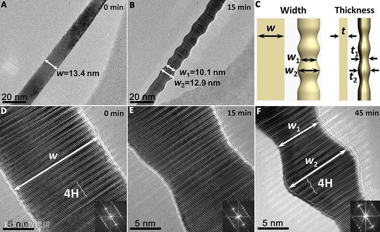 图3. 超细4H金纳米带在高温下的4H-FCC相结构演变。图片来源:Matter