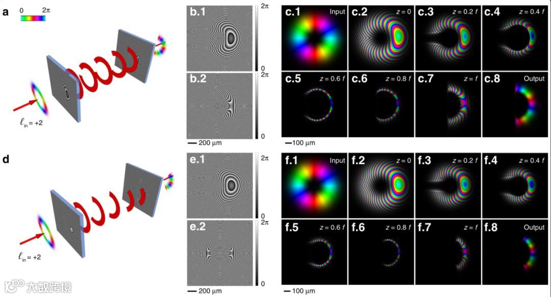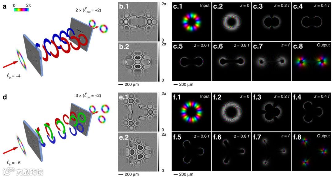 图3 OAM光的分割。OAM光分割原理图,2倍(n=2) a和3倍(n=3) d OAM光束圆扇形变换原理图。一阶相位模式(b1,e1)执行一个具有多个扇形变换,将输入强度映射分布到2π/n弧度。二阶相位模式(b2,e2)执行所需的相位校正,保持压缩的方位角相位分布。设计参数:a= 300μm, b = 250μm, f = 20mm。数值模拟的传输输入拉盖尔-高斯光束l=2 (c1, f1),通过第一个元件(c2,f2),在不同的位置(z=0.2f (c3,f3), z=0.4f (c4,f4), z=0.6f (c5,f5), z=0.8f (c6、f.6)),至第二光学元件(c7,f7),输出相位校正光束(c8,f8)。颜色和亮度分别表示相位和强度。