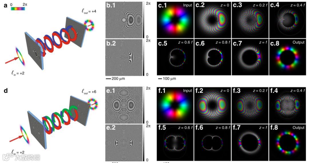 图2 OAM光的倍增。OAM光束乘法器原理图,2倍(n=2) a和3倍(n=3) d OAM光束圆扇形变换原理图。一阶相位模式(b1,e1)执行一个具有多个扇形变换,将输入强度映射分布到2π/n弧度。二阶相位模式(b2,e2)执行所需的相位校正,保持压缩的方位角相位分布。设计参数:a= 300μm, b = 250μm, f = 20mm。数值模拟的传输输入拉盖尔-高斯光束l=2 (c1, f1),通过第一个元件(c2,f2),在不同的位置(z=0.2f (c3,f3), z=0.4f (c4,f4), z=0.6f (c5,f5), z=0.8f (c6、f.6)),至第二光学元件(c7,f7),输出相位校正光束(c8,f8)。颜色和亮度分别表示相位和强度。