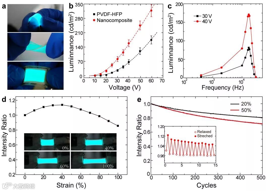 研究团队将制备的可拉伸高介电材料和ZnS:Cu粉体混合作为弹性发光层,同时改进浆料分散工艺,将发光层薄膜厚度控制在10微米左右,最终得到低压驱动的高亮度发光器件。发光器件在35V、17k Hz的驱动电压下发光亮度超过100cd/m2。所制备的器件可以在弯曲、扭转、拉伸至100%状态下依然保持正常发光。同时器件反复拉伸20%和50%500个循环后依然可以保持70%以上的初始亮度。