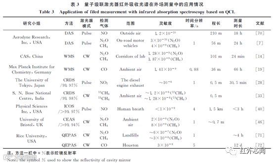 随着量子级联激光器红外吸收光谱的日益成熟,使得外场痕量气体探测成为了可能。目前已有多个国家的研究小组开展了对痕量气体的外场检测。表3给出了部分研究小组利用量子级联激光器红外吸收光谱对痕量气体进行外场测量的应用情况。从表中可以看到,对痕量气体的探测并不拘泥于特定的测量方法,每一种方法都可以通过改变测量条件实现较高的探测灵敏度。例如DAS方法可以结合多通池增加吸收程长,CRDS和CEAS/ICOS方法可以通过高反射率镜片提高探测灵敏度。从检测气体上看,主要是针对常见的痕量气体,如CH4和N2O等,探测灵敏度一般都在10-8量级,检测范围涉及外场空气、汽车尾气、呼吸气体等。