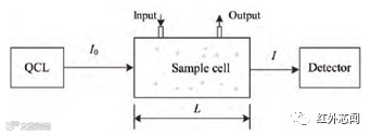 直接吸收光谱(direct absorption spectroscopy,DAS)是吸收光谱中的基础。如图1所示,QCL发出的激光束通过一定长度的吸收池,光电探测器接收经透射后的激光信号,通过处理有无吸收时的透射激光强度,得到气体样品的吸收光谱,根据Beer-Lambert定律,得出气体样品浓度。