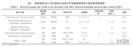 除了上述提到的5种常见的量子级联激光器红外吸收光谱技术外,还有一些方法也被应用在了吸收光谱测量上,如差分吸收光谱(differential optical absorption spectroscopy,DOAS)、法拉第旋光效应光谱(faraday rotatory spectroscopy,FRS)以及毛细吸收光谱(capillary absorption spectroscopy,CAS)等。20世纪80年代,DOAS和FRS分别由Platt和Litfin等提出,DOAS方法是利用了气体分子对光线的差分吸收特性,检测精度不高,容易受到噪声和波段选择的影响。FRS方法是通过外加磁场产生法拉第旋光效应而获取气体浓度,通过对磁场进行调制能够实现高灵敏气体探测,但可检测的范围仅仅局限于顺磁性分子(NO,NO2等)。CAS是美国太平洋西北国家实验室(PNNL)的Kelly等提出来的,实际上是利用中空光纤作为吸收气室,中空光纤的内径一般在2000 - 500um,相比于传统的多通池,气体样品体积减少了几个数量级,并且有着相对较长的吸收程长。表2给出了相关研究小组利用这些方法进行气体检测的情况。从表中信息可以看出这些方法经过合理的应用也能够获得相对较高的灵敏度。