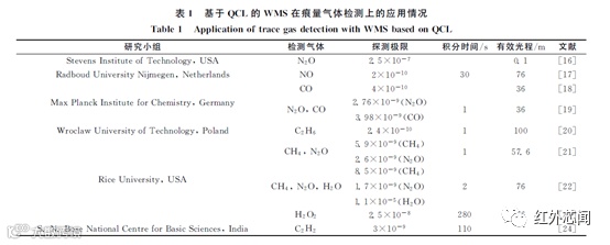 基于QCL的WMS经常会配合多通池,而应用最多的就是在痕量气体的检测上。表1给出了利用该方法进行痕量气体检测的研究小组及其实验参数,从表中可以看到已经有多个国家对此展开了研究,并且都有着较高的探测灵敏度。在呼吸气体应用中,Owen等利用WMS对人体呼出的NH3进行了检测,使用工作在9.06μm的QCL作为光源,以有效吸收程长为76.45m的多通池为吸收室,探测极限达到7×10-9。对燃烧气体的研究中,美国斯坦福大学的高温气体动力学实验室利用基于EC-QCL的WMS,实现了对燃烧气体中NO的实时检测,在有效吸收程长3m的情况下,得到探测极限为1×10-5。在高温气体探测中,Sur等报道了首次搭建起的基于QCL的高灵敏度高温(1000~1200K)检测NO2的装置,利用WMS在600K和800K时,实现可探测浓度分别为1.45×10-6和1.6×10-6。