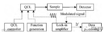 波长调制(wavelength modulation spectroscopy,WMS)技术早在20世纪90年代末就已经与QCL结合起来了,是十分成熟的高灵敏度吸收光谱测量方法。典型的基于QCL的WMS系统框图如图2所示。探测器得到的吸收信号被送入锁相放大器,解调出二次谐波(2f)信号,从而获得气体浓度。