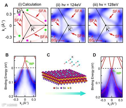 图2.拓扑表面态费米弧和体态外尔节点的观测(A)理论计算的费米弧(i),实验测量的不同光子能量的费米弧(ii-iii);(B)指向费米能级以上外尔节点的线性色散能带;(C)采用K原子原位沉积进行抬升费米能;(D)测量的能带展现出线性交叉外尔节点