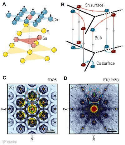 图3. Co3Sn2S2的费米弧和准粒子干涉花样(A)具有面外铁磁序的Co的Kagome晶格;(B)Co晶面和Sn晶面面间和面内的外尔节点之间的费米弧及半经典电子输运轨迹;(C,D)-5 meV能量时的理论计算和实验测量的电子态密度对比,(D)中微分电导的傅里叶变换展现出丰富的准粒子干涉花样