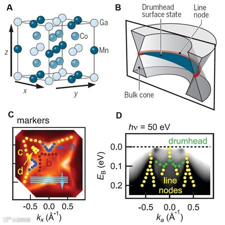 图4. Co2MnGa的外尔节线环和鼓膜表面态(A)晶体结构;(B)外尔节线环示意图,红色为节线环,蓝色二维面是鼓膜表面态;(C)基于ARPES谱动量-能量分布曲线所获得的外尔节线环;(D)基于ARPES谱动量-能量分布曲线所获得的外尔节线(黄色)和鼓膜表面态(绿色)