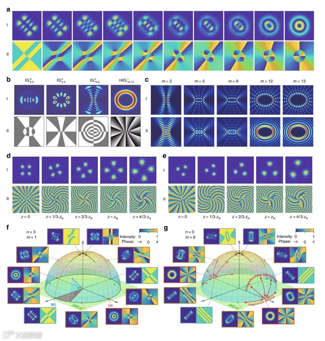 OV的种类丰富多样,如基本光束模式中的拉盖尔-高斯(Laguerre–Gaussian,LG)模式、厄密-拉盖尔-高斯(Hermite–Laguerre–Gaussian,HLG)模式、涡旋恩斯高斯(Ince–Gaussian,IG)模式、奇点混合演化(Singularities Hybrid Evolution,SHEN)模式、贝塞尔(Bessel)模式、马丢(Mathieu)模式、SU(2)几何模式等,还包括如光学莫比乌斯(Möbius)环、涡旋纽结等复杂的空间涡旋拓扑模型。