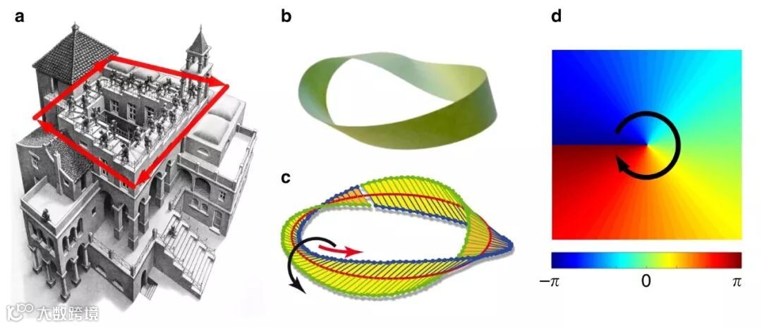 图三 涡旋光束的基本拓扑结构贯穿于艺术、科学领域:彭罗斯阶梯(a)、莫比乌斯环(b,c)与涡旋相位(d)属于同构的拓扑结构。