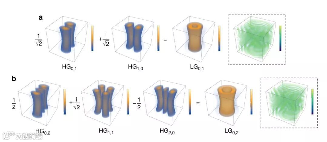 图四 涡旋光束的分解:LG涡旋光束可表示为以HG模式为基底的线性组合(虚线框内为空间涡旋的相位分布)。