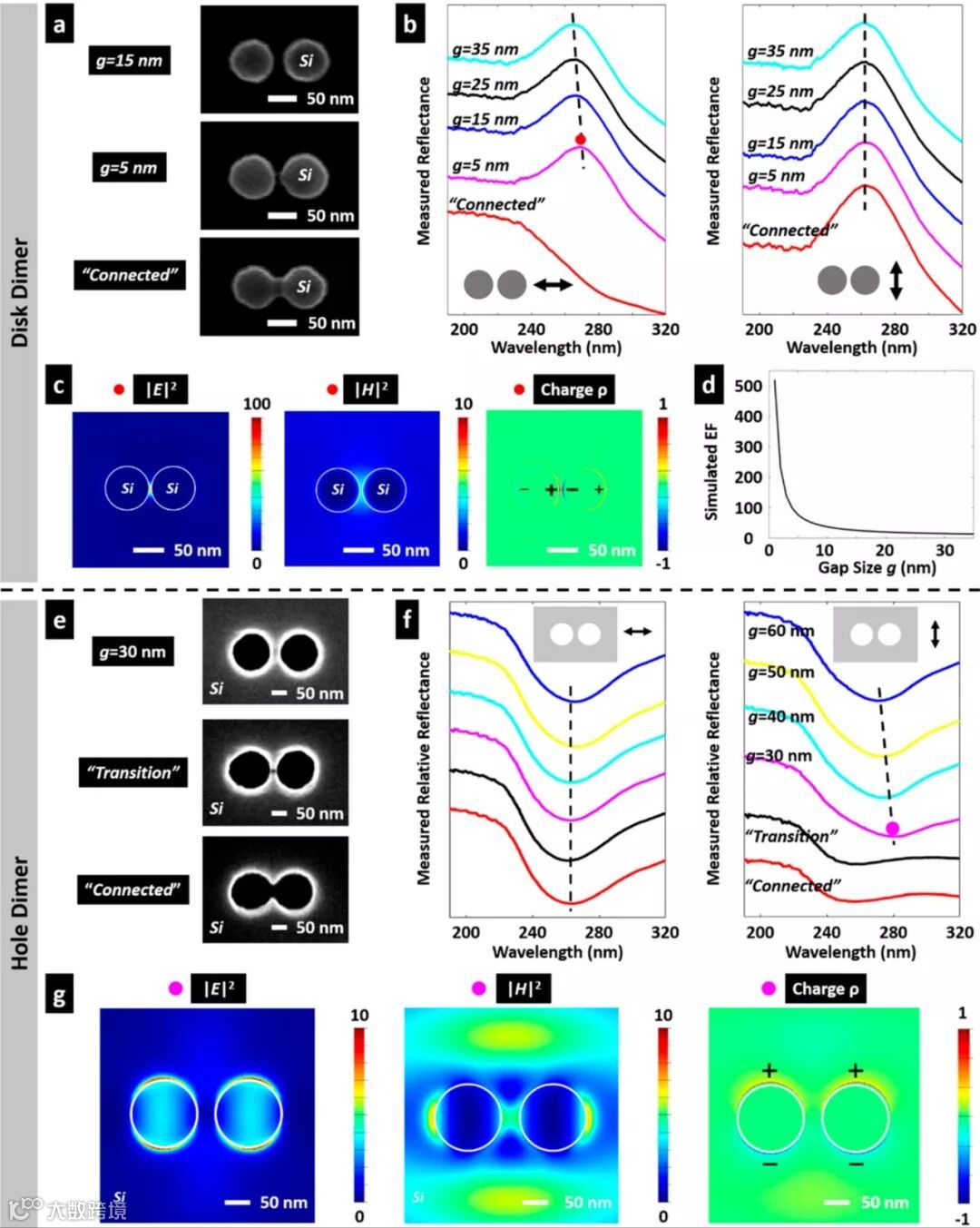 (a)硅圆柱双耦合体的扫描电镜图。间距有15纳米,5纳米和相连。(b)x和y偏振下的实验反射谱。硅圆柱双耦合体在x偏振下有光学耦合。(c)硅圆柱双耦合体在5纳米间距的共振电磁场分布。(d)光场强度随着间距的变化。(e)硅孔洞双耦合体的扫描电镜图。(f)x和y偏振下的实验反射谱。硅孔洞双耦合体在y偏振下有光学耦合。(g)硅孔洞双耦合体在30纳米间距时的共振电磁场分布。