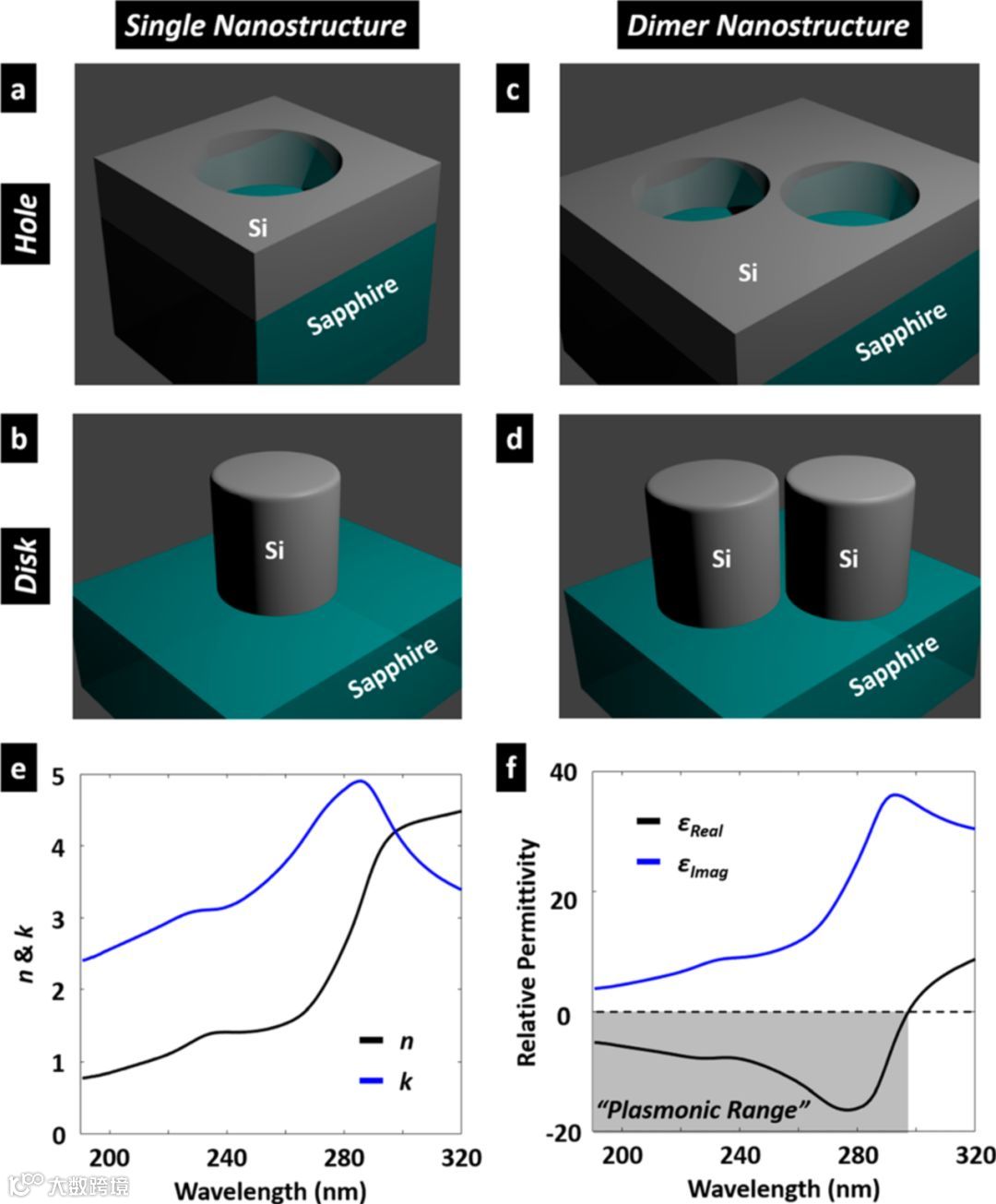 (a)硅薄膜上的单个孔洞。(b)单个硅圆柱。(c-d)孔洞和圆柱的双耦合体。(e-f)硅在紫外波段的折射率和介电常数。