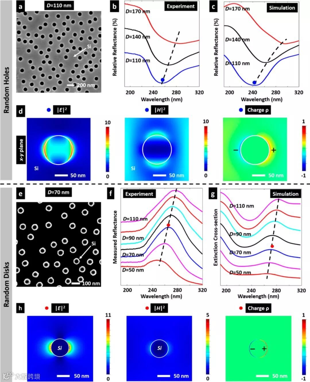 (a)单个孔洞的扫描电镜图。(b-c)对于不同孔洞直径的实验和模拟反射谱。(d)孔洞在共振时的电磁场分布。(e)单个硅圆柱的扫描电镜图。(f-g)对于不同硅圆柱直径的实验和模拟反射谱。(h)硅圆柱在共振时的电磁场分布。