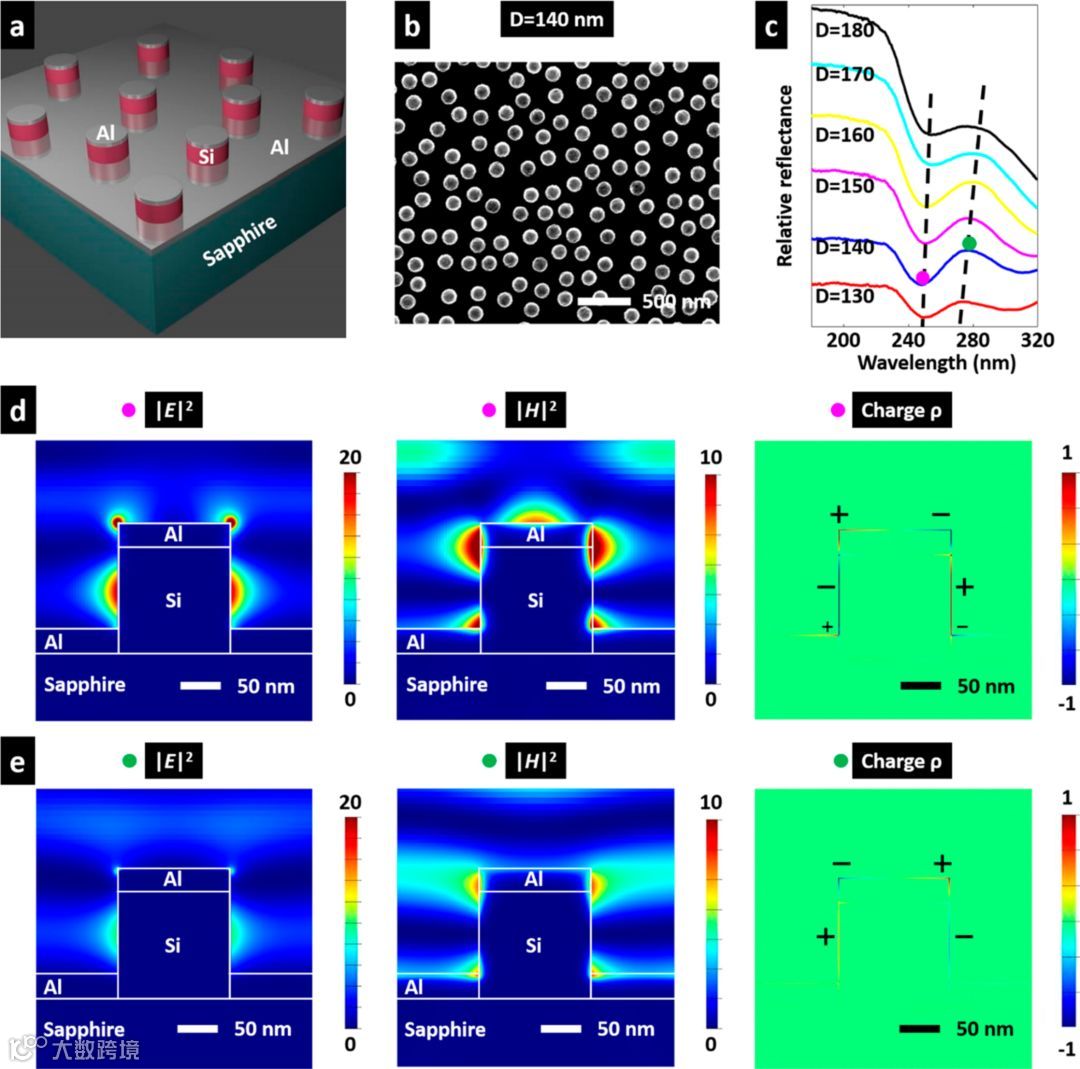 (a)硅-铝混合纳米结构的示意图。(b)硅-铝混合结构体(直径140纳米)的扫描电镜图。(c)反射谱随着直径的变化。(d-e)硅-铝混合结构在不同耦合条件下的电磁场分布。