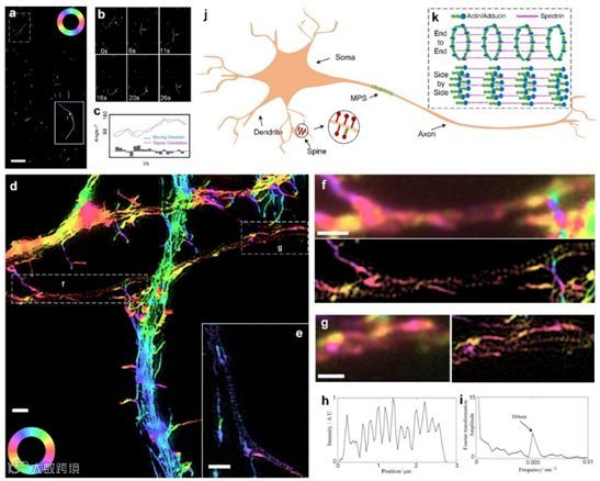 为了验证这一技术与SIM的广泛兼容特性,研究人员测试了多种商用SIM系统及自主搭建的SIM平台,以及2D-SIM、3D-SIM、TIRF-SIM成像能力,成功提取荧光分子的偶极子方位信息与超分辨结构信息。同时,研究人员进行了大量的生物学实验来证明其广泛的适用性,如λ-DNA、BAPE细胞和小鼠肾组织中的肌动蛋白丝、肌动蛋白和肌球蛋白之间的相互作用,以及中GFP染色的U2OS活细胞微管。特别是,研究小组针对神经元中的膜相关周期骨架(MPS)进行了研究。pSIM以高的空间分辨率和准确的偏振检测,揭示了肌动蛋白环在MPS中“并排”组装的新模型,推翻了以往发表在Science上的肌动蛋白环“端到端”的结构假设【3,4】。pSIM具有高的时空分辨率和独特的偶极子方向信息,在未来解决各种生物问题方面具有广阔的应用前景。