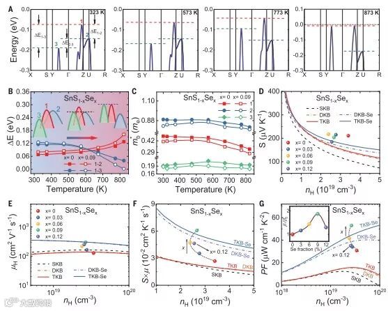 该工作通过温度梯度法合成出 SnS1-xSex 晶体结构,并实现三个分离电子能带之间相互作用的控制。Se 的引入实现电子传输(μ)和有效质量(m*)两大参数的同时优化。300 K 时,PF 值从 30 升至 50 mW cm−1 K−2; 873 K 时,ZT 最大值和均值分别为 1.6 和 1.25。这种控制策略为优化热电性能提供了一条不同的途径。开发高性能SnS晶体是向低成本、地球资源丰富和环境友好型热电技术迈进的重要一步。