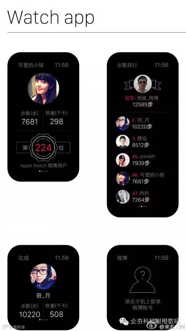 神速适配,目前微信和支付宝针对Apple Watch的适配已经完成,现在又有网友带来了微博for Apple Watch的截图。从图片来看,针对Apple Watch的微博版本号为5.1.5(目前最新iOS版为5.1.3),内容似乎已经变身为一款计步排行APP,不但可以记录当天走的步数和消耗的卡路里,还能与微博好友PK。