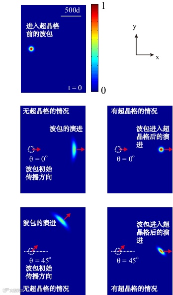 当前述二维光子晶体被施加一维周期调制的光子势,即光子势仅沿某一方向周期变化(图2)时,赝自旋为1的电磁波波包在该结构内的传播并不像在单一光子晶体中那样迅速向两侧扩散,而是保持形状不变,而且不管其初始传播方向如何,在该结构内始终沿光子势调制方向传播(图3),这一现象被称为超准直现象。该现象也曾在自旋为1/2的赝自旋超晶格中被发现,但其要求该超晶格的周期和势垒高度必须满足一定的关系,而在赝自旋为1的系统中,超准直现象的发生无需任何前提条件。