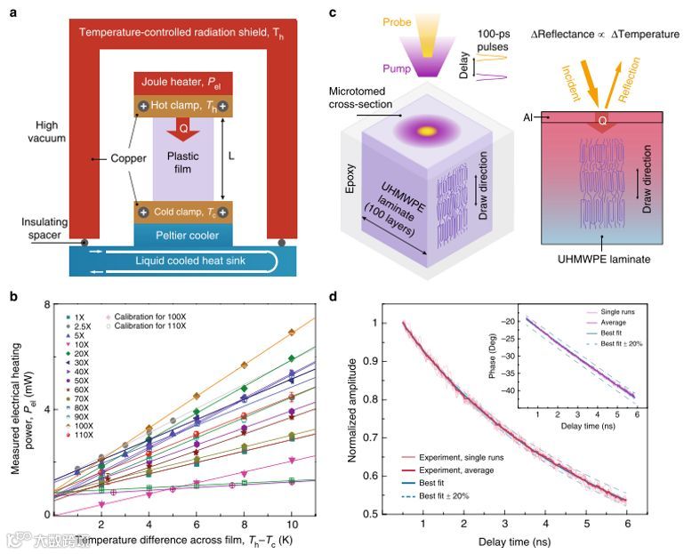 图2. 沿聚合物薄膜的拉伸方向的热传输测量。a 国产稳态热导率测量系统示意图;b 测量电加热功率 (Pel) 与薄膜温差 (Th-tc) 的函数。误差条表示在1分钟的采样率为1Hz的情况下测量的最大和最小电加热器功率值;c 双色时,域热反射测量方案;d 以信号振幅(浅红色线)表示的10条单独的冷却曲线, 涵盖了其平均值线(深红色)和最佳拟合曲线 (蓝色实线,导热系数31.9Wm-1K-1)。将最佳拟合曲线浮动20% 会导致模拟曲线 (蓝色虚线) 和实际测量曲线之间存在较大偏差。插图显示相应的相位信号,导热系数为 32.8Wm−1 K−1。