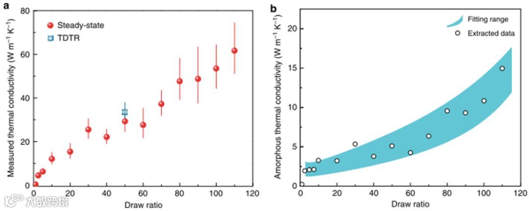 图3. 聚合物薄膜的测量和热导率计算。a 总导热系数的拉伸比的函数图。红色球体表示从稳态实验中得到的数据。从 x110 薄膜中测定得到了 62Wm−1K−1的导热系数。蓝色正方形表示在3和 6 MHz 调制下的20个瞬态热反射测量的平均值。TDTR误差条表示使用3和6 MHz 泵调制在具有代表性的位置进行的20多个独立测量的标准偏差 (s. d.);b 根据SAXS分析的拟合结构参数提取无定形导热系数值。
