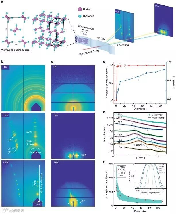 图4使用同步辐射X射线散射对结构的表征。a 结晶聚乙烯的实验布置和正交晶胞示意图; b x1、x10 和 x110薄膜的WAXS图; c x1、x10和x90薄膜的SAXS图, 清楚地显示出各向异性的过渡变化;d 一阶取向参数和从WAXS获得的有效结晶度;e SAXS模式沿绘制方向散射强度线; f 一个周期单元中无定形区域的含量和拉伸比的函数。