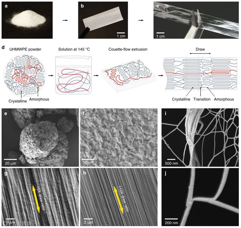 图1. 高导热性聚合物薄膜的制备和表征。a-c 商用超高分子量聚乙烯粉末、聚乙烯厚膜和聚乙烯透明拉伸薄膜;d 制备过程中薄膜形态变化图。e SEM图中的一些超高分子量聚乙烯粉末。标尺20μm;f 作为挤出薄膜的SEM图。标尺10μm;g 10x拉伸比膜的SEM图,标尺2μm;h x110拉伸比薄膜的SEM图,标尺2μm;i, j x70拉伸比薄膜的SEM 图,标尺分别为500nm和200nm。
