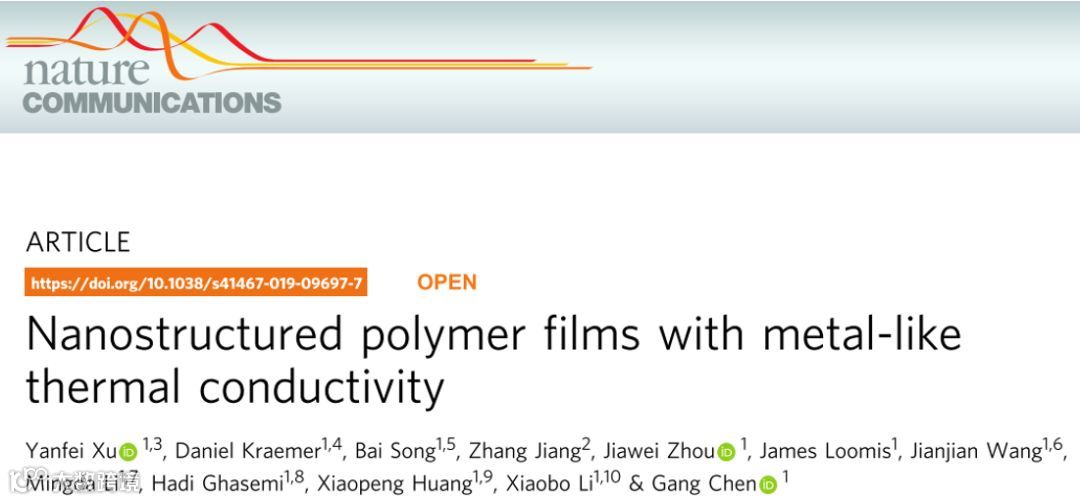 近日, 美国麻省理工学院机械工程系主任陈刚教授团队报道了一种高导热性聚乙烯薄膜,导热系数高达62Wm−1K−1,导热性比一般典型聚合物(约0.1 Wm−1 K−1) 高两个数量级以上,超过了众多传统金属和陶瓷材料。(如:304不锈钢约为15Wm−1K−1,氧化铝约为30 Wm−1 K−1)。