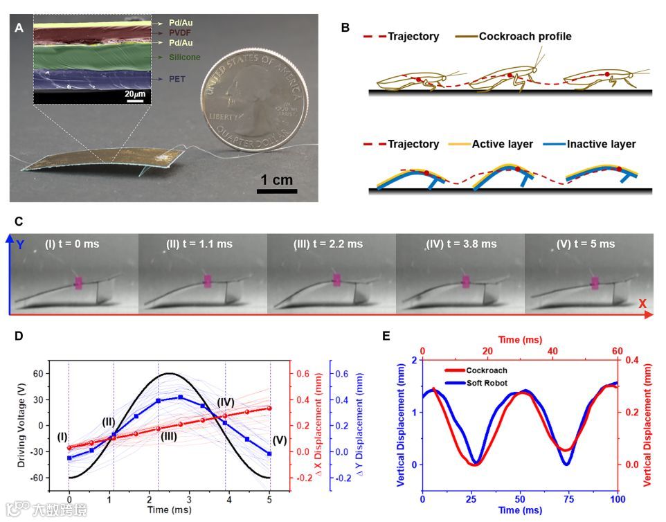 近日,清华-伯克利深圳学院吴一川等人本研究提出了一种基于弯曲单晶压电结构的柔性机器人,其相对速度为每秒20个体长,与快速移动的节肢动物相当,是已报道的昆虫机器人中速度最快的。这款软体机器人运用了多种动物运动的原理,不仅能够负重、爬坡,而且具有蟑螂的健壮性。更令人惊奇的是在承受了成人脚步的重量(大约是机器人的100万倍)后,该昆虫机器人仍存活了下来,并在之后继续移动。可以说是一只“打不死的小强”。相对较快的运动速度和较强的鲁棒性归功于具有较大振幅振动的弯曲单晶压电结构,这是其他方法无法比拟的。此外,该机器人可以在只有8 v的低电压下工作,这表明了进一步集成板载电路在未来的应用前景。在测试过程中研究人员发现更高的谐振频率,更小的体积可以进一步提高相对速度,但精密制造、供电线路的要求和不受约束的操作可能是追求小型机器人的关键挑战。该设计原理、驱动机构和工作特性可以进一步优化和扩展,以提高性能,它在环境探测、结构检测、信息侦察和救灾等方面具有潜在的应用前景,也可用于其他柔性器件。相关研究工作发表在《Science Robotics》上。