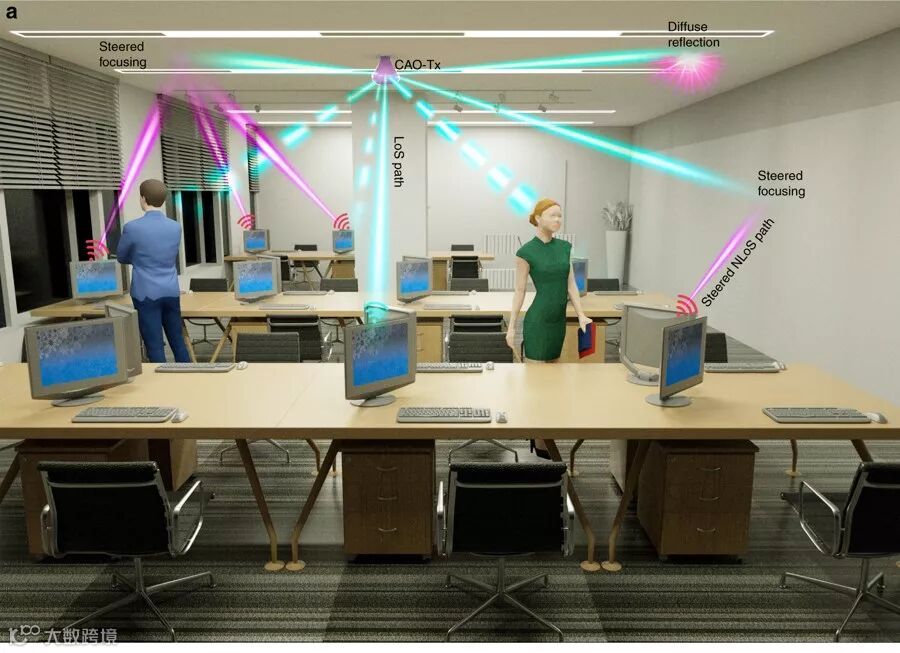 光无线通信的研究为通讯能力带来了新的突破。光无线通讯拥有大量可用的光谱范围,从而允许超高容量和无电磁干扰的无线通讯。然而,当发射器和接收器之间的直接通路被障碍物阻挡时,光无线通讯的挑战就出现了。利用散射材料(天花板、墙面等)的漫反射光来建立的非视距光路其强度远低于直接到达接收器的准直入射光束。