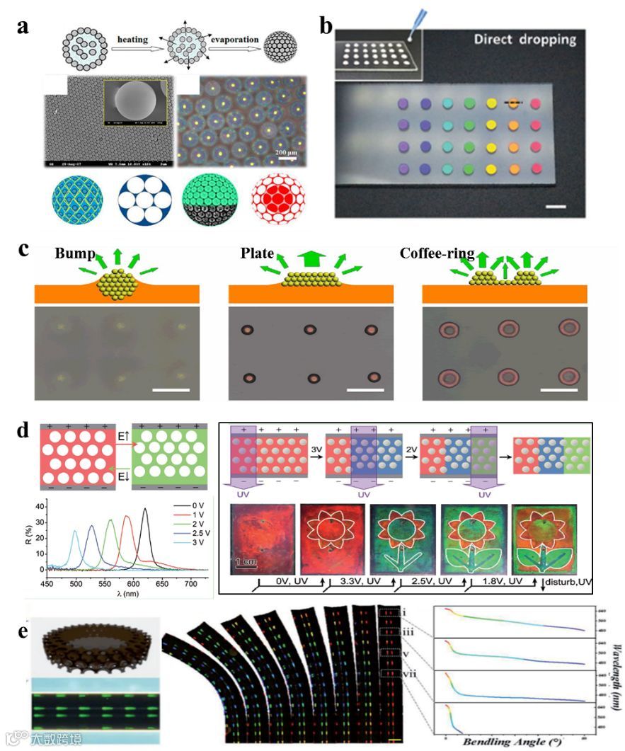 我们开发了一种新型控制胶体组装的方法:采用打印技术,使用具有可控流变性的聚二甲基硅氧烷(PDMS)作为基底,利用液滴的局部形变和三相接触线的可控移动的协同作用来控制光子晶体的组装形式(图3c),从而实现将不同形状的光子晶体点(包括光子晶体微球、光子晶体微盘和光子晶体环)可控集成在一个芯片中,通过设计和排列三种不同形貌的光子晶体点即可得到具有多维信息存储功能的光子晶体二维码。最近,Ge等制备出电场响应、结构色及灰度可调、同时可迅速光固化的光子晶体电子墨水(如图3d)。Zhao等通过胶体纳米粒子在毛细管中的快速自组装,在毛细管内壁,构筑了石墨烯水凝胶结构色条纹,制备得到一种具有防伪功能的动态条形码标签(如图3e)。