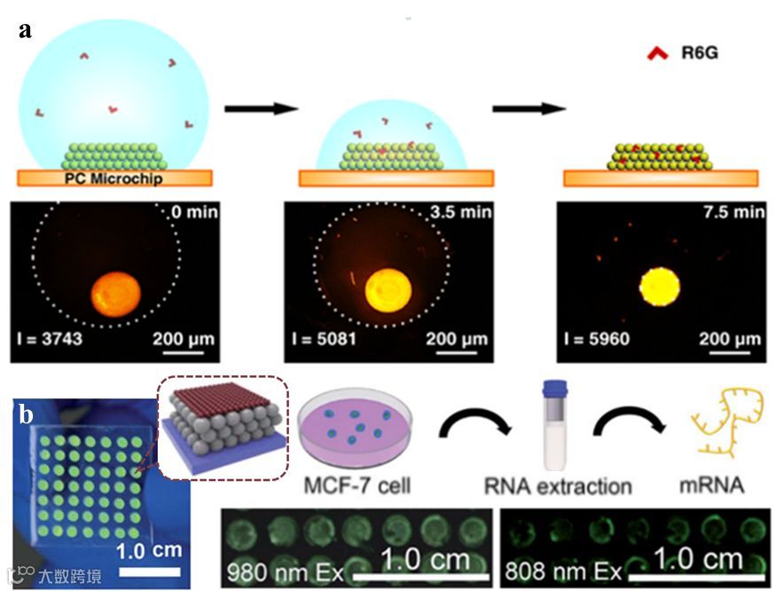 另外,将胶体光子晶体增强发光技术与功能性微阵列相结合,可以为痕量检测和复杂系统分析提供一种新的通用方法。我们提出了一种亲-疏水微图案化胶体光子晶体超痕量检测芯片(图8)。这种胶体光子晶体微芯片相对于传统的胶体光子晶体薄膜将检测限降低了4个数量级,降至10-16 mol L-1,可与现有的荧光分析系统结合使用。基于相同的机制,yuan等开发了一种可视化的与肿瘤相关的多种mRNA检测装置,为多种mRNA的高精度和高灵敏检测提供了一种便携式可视化技术,可提高早期癌症诊断准确性。