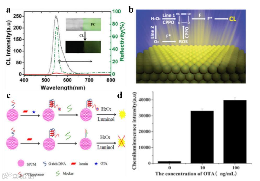 除了光致发光外,化学发光由于其背景噪音干扰少,特异性高、敏感、分离简便、安全稳定等优点,化学发光技术已经成为当前免疫诊断市场中最重要的检测技术。然而传统的化学发光中,当分析物浓度较低时,有机染料的量子效率低,信噪比差,慢光持续数秒至数小时。在我们的研究中,利用胶体光子晶体将化学发光增强了44.9倍(图10a)。除了提高发光强度之外,由于胶体光子晶体的大孔结构提供了大量微反应器,可以实现快速的传质和反应,胶体光子晶体还能够加速化学发光强度的衰减。同时,胶体光子晶体具有大的比表面积,可以增加基底对于探针分子或者生物分子的负载。因此,光子晶体可以增加化学发光的信号并缩短化学发光的检测时间,这对基于化学发光的测定具有重要意义。例如,Li,Zheng等使用单一胶体光子晶体微球开发了一种高通量低背景G四链体化学发光法测定赭曲霉毒素A(OTA),胶体光子晶体球体易于处理,在整个测定过程中便于追踪,使检测更便捷,具有高灵敏和低噪声等优点(图10d)。