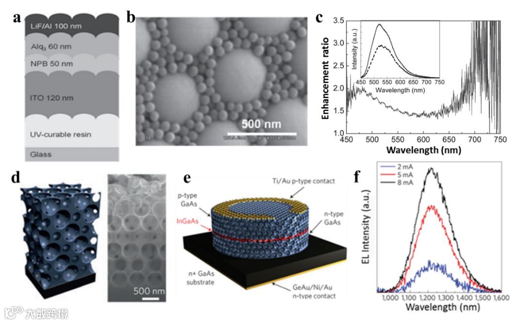此外,胶体光子晶体还可增强光提取,用于发光二极管(LED)的增强发光。LED逐渐成为传统光源替代品,它具有尺寸小,效率高,寿命长等特点。然而,由于半导体和空气之间的折射率差异很大,产生的大部分光被限域在LED内部,使其光提取效率降低。光子晶体不仅能大幅度提高LED的出光效率,而且还能很好地控制器件的发光分布。Wierer等人通过激光刻蚀法将光子晶体结构引入基于GaN的LED,提高光提取效率,但这种方法成本昂贵,很难实现大面积制备。相比较而言,基于自组装胶体球的方法具有成本低和可扩展等优势,能够有效提高LED的光提取效率。So等用局部六边形封闭封装(HCP)结构制造出有缺陷的阵列,并将其纳入有机发光二极管,得到了宽带朗伯体发射器(图12b,c)。 Braun等通过3D 胶体光子晶体模板来构建具有纳米空隙光子晶体结构的高级LED,为3D纳米结构光电器件提供独特的途径(图12d-f)。Lee等制造了(V-LED)锥形纳米结构,侧壁角度为24.1°,光提取效率比平面V-LED高出300%。