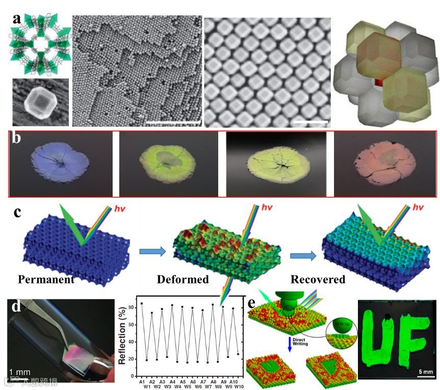 除了新的制造方法,新的功能材料也促进了新型光子晶体的发展并扩展了它们的应用。López,Maspoch等报道了由MOF制造的“ZIF-8”和“UiO-66”光子晶体(图2a,b),Li,Chen等制备了具有反蛋白石结构的MOF单晶。Jiang等利用具有压力响应特性的形状记忆聚合物,构建出可重构的形状记忆光子晶体(SMPC)(图2c-e),可以通过施加压力来调节光子晶体的颜色,可以用作压力响应膜。此外,图案化的形状记忆光子晶体膜可以在大气环境条件下保持其鲜艳的色彩和清晰的图案超过2年,并且可以用水擦除,为可擦写信息存储材料的制备提供了新的途径。