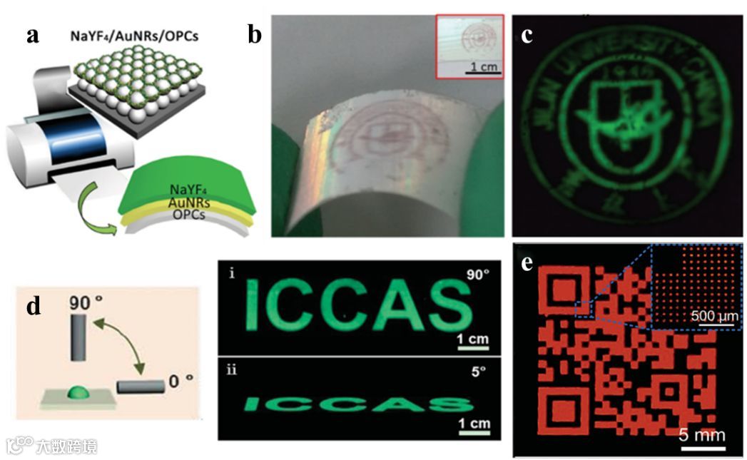 发光技术广泛用于显示和光存储,在光学读出过程中,放大发光对比度对于灵敏度和分辨率的最大化以及降低错误率是十分必要的。胶体光子晶体衬底可以用作介质反射镜,可以增强光的定向发射强度。我们在基于荧光ON / OFF的信息存储系统中引入了胶体光子晶体基板,实现了40倍的信号强度增强和7倍的ON / OFF放大比率。Xu,song等人提出上转换发光(UCL)的明亮多彩显示器(图11a-b),将上转换纳米荧光粉组装在AuNRs / 胶体光子晶体复合材料的表面,完美结合了AuNRs的表面等离子体效应和3D PMMA蛋白石的光子晶体效应。这使得激发光和光提取的效率大大提高,能够产生强烈的自发发射和明亮的成像(图11c)。此外,不同形貌的胶体光子晶体材料也可以诱导各种光学效应。例如,通过构筑无角度依赖的图案化光子晶体穹顶,实现了大尺寸、灵活、宽视角的荧光图像。具有高H/D比的光子晶体穹顶可以增强光子晶体穹顶内掺杂的染料的荧光强度,在0°至180°之间呈现出优异的宽视角(图11d),并且可以用于二维码的设计和制备(图11e)。