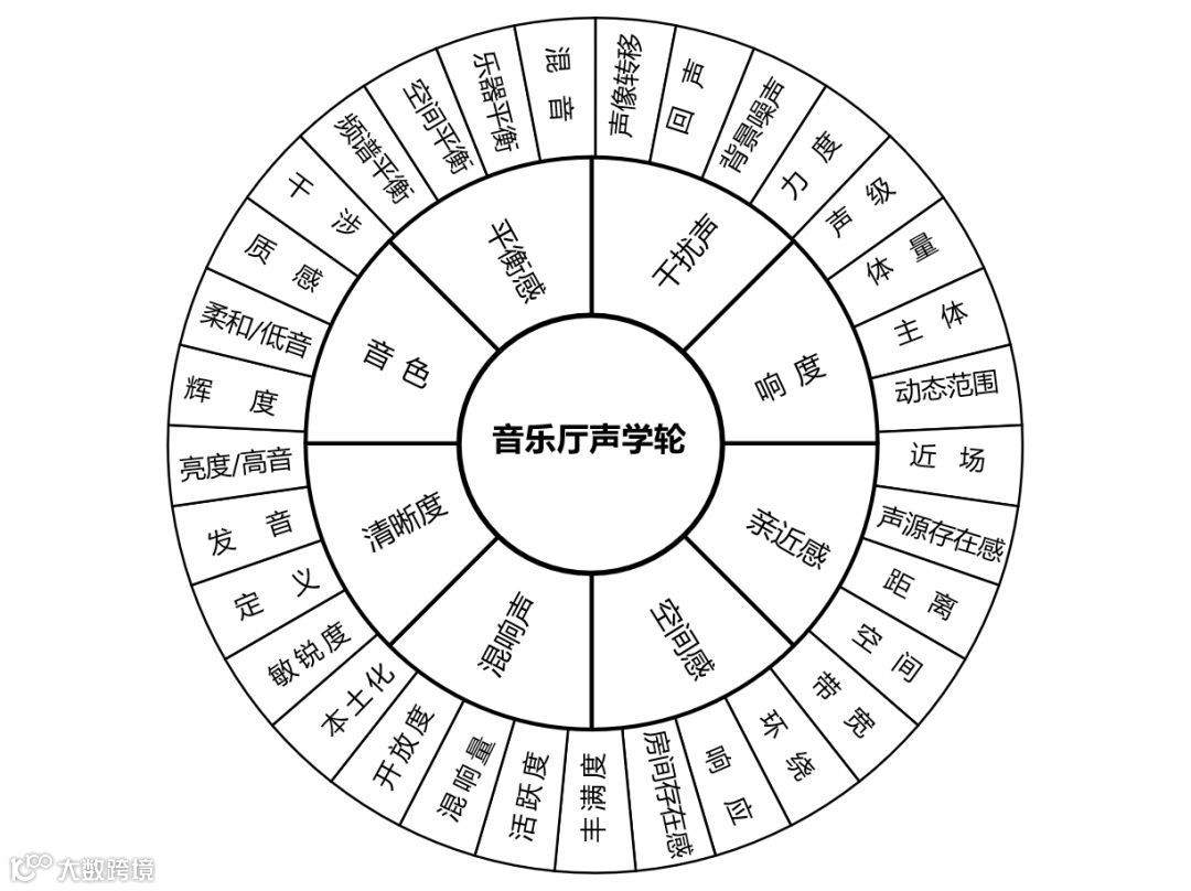 听众乐于融入音乐,但这一需求的声学含义是复杂且高度主观的。几十年来,这个问题一直是丰富多样研究的焦点,包括Beranek(1962、1996、2004),其相关成果在Markham, 2014中有所总结(Hawkes and Douglas (1971), Schroeder et al. (1974), Soulodre and Bradley (1995), Lokki et al.(2012)等人在《今日声学》之前的一期中总结了这一观点)。这些研究建立了相关感觉特征的通用词汇表,并试图从几个关键因素中提取出听者偏好与感知之间的关系,但音乐厅的听觉感知确实是多维的。Kuusinen和Lokki(2017)最近提出了一种“音乐厅音响之轮”的观点,如图1所示,将相关感知因素分为8类:清晰度、混响、空间印象、亲近感、响度、平衡感、音色以及降噪(无关声最小化)。