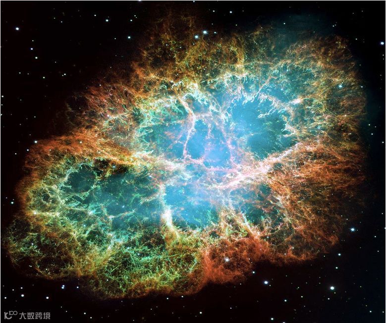 上图为哈勃太空望远镜(HST)于1999年到2000年拍摄的蟹状星云的多色图,它的半径已经扩展到6光年,即大约60万亿千米。由于其尺寸太大,HST分24次拍摄了不同部分,然后把24张图拼接为一张图。