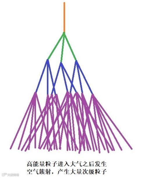 那个超高能光子也在进入大气之后与大气分子中的粒子相互作用,产生了其他高能粒子,这些高能粒子又与周围的大气分子中的粒子相互作用,产生了更多其他粒子,这个连锁反应会发生多次,因此被称为“大气簇射”,其结果是一个高能粒子激发出众多粒子。