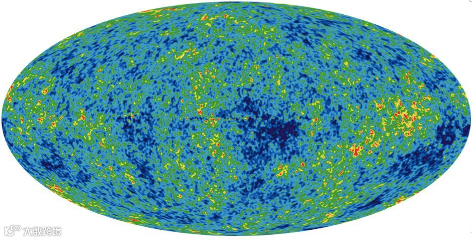 图:WMAP 卫星9年探测得到的微波背景辐射分布图,微波背景辐射没有颜色,图中颜色为伪色 | NASA / WMAP Science Team