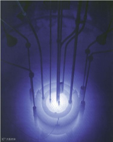 图:位于里德学院的供科研使用的水下核反应堆的堆芯附近的蓝色切伦科夫光 | United States Nuclear Regulatory Commission