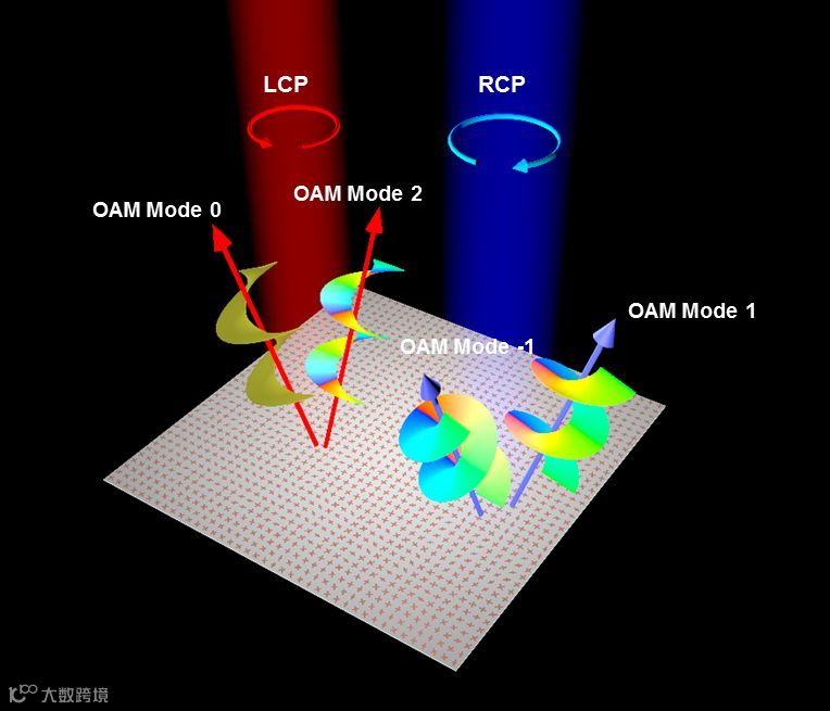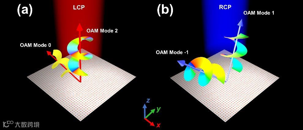 (a)超构表面在左旋圆极化入射时,产生OAM模式为+2和模式为0(平面波)的异常反射涡旋电磁波;