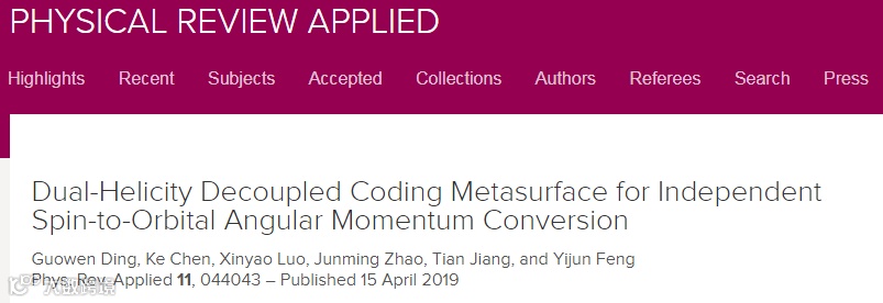 携带OAM的涡旋波束在通信领域具有较大潜在应用价值,因而该研究能够为设计高通信容量的多功能涡旋波束器件提供有益指导。相关研究成果以《Dual-Helicity Decoupled Coding Metasurface for Independent Spin-to-Orbital Angular Momentum Conversion》为题,发表在近期的《Physical Review Applied》上(DOI: 10.1103/PhysRevApplied.11.044043)。论文第一作者为博士生丁国文,陈克博士、冯一军教授为论文共同通讯作者。