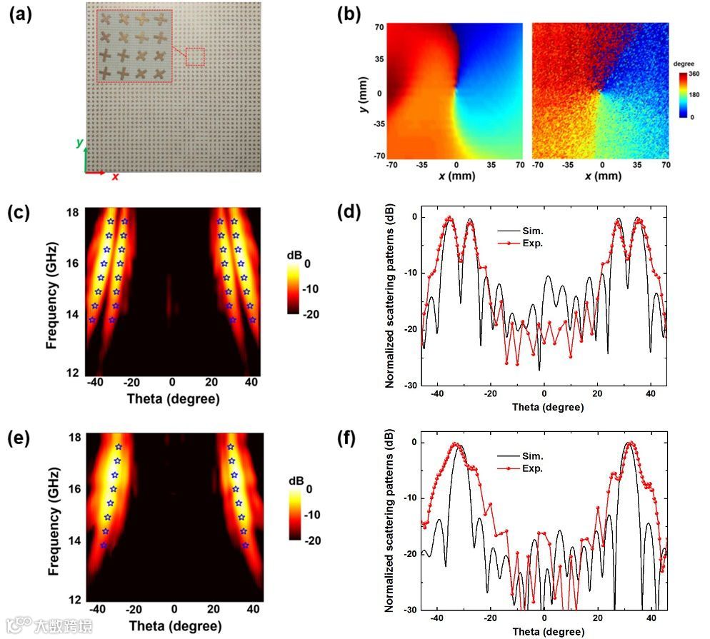 (b)在16 GHz处涡旋波(OAM模式为+1)的近场相位的仿真分析和实验测试结果;