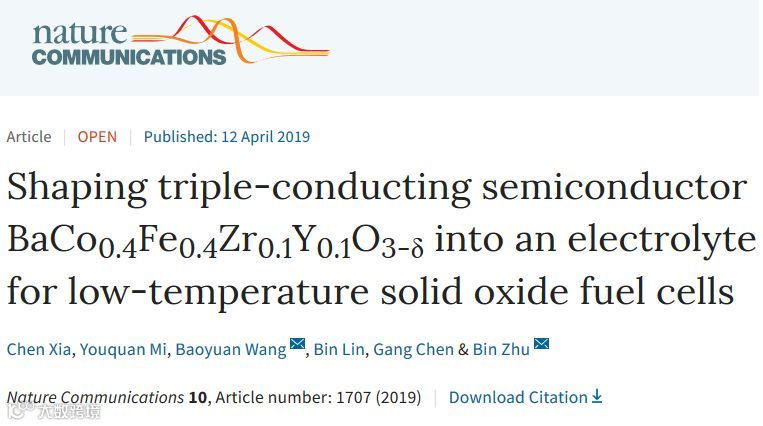 Chen Xia, Youquan Mi, Baoyuan Wang,Bin Lin, Gang Chen, Bin Zhu. Shaping triple-conducting semiconductor BaCo0.4Fe0.4Zr0.1Y0.1O3-δ into an electrolyte for low-temperature solid oxide fuelcells. Nature Communications, 2019.