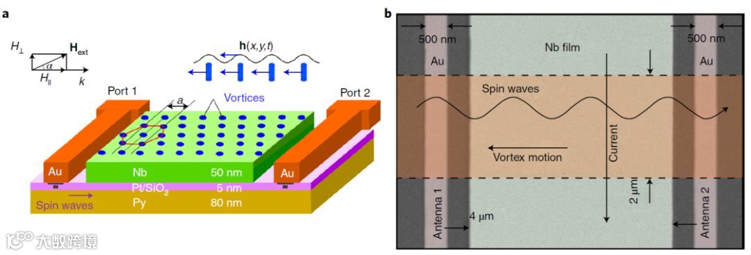 铁磁性与超导性是凝聚态物理中最基本的现象。由于具有相反的自旋序,两者具有重要的概念相似性:磁性材料中的磁序扰动能以自旋波(磁振子,magnon)的形式传播;而磁场以磁通量子(fluxon)晶格的形式穿透超导体。尽管大量的波动和量子现象已被预测,但磁振子-磁通量子耦合尚未被实验证实。德国法兰克福大学O. V. Dobrovolskiy等人的研究表明,在Py/Nb(铁磁体/超导体)双层异质结中,自旋波与磁通晶格存在相互作用。作者发现,在此系统中,磁振子频谱表现出类布洛赫能带结构,能通过偏置磁场调整。此外,在超导体中施加电流的情况下,移动磁通晶格散射的自旋波的频谱出现了多普勒频移。