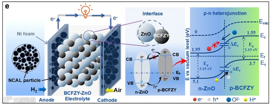目前人们对固体氧化物燃料电池低温操作的兴趣不断增长,钙钛矿相的最新进展已经为低温燃料电池(LT-SOFC)产生了有效的H+/O2-/e-三重导电电极BaCo0.4Fe0.4Zr0.1Y0.1O3-δ(BCFZY)。湖北大学Bin Zhu和Baoyuan Wang团队利用其高离子传导进一步开发BCFZY,通过将p型BCFZY与n型半导体ZnO结合,构建p-n异质结构来抑制其电子传导,然后将形成的均匀异质结构材料夹在两个Ni0.8Co0.15Al0.05LiO2-δ(NCAL)电极之间,构建燃料电池组件。