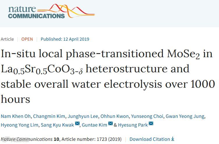 Nam Khen Oh, Changmin Kim, JunghyunLee, Ohhun Kwon, Yunseong Choi, Gwan Yeong Jung, Hyeong Yong Lim, Sang KyuKwak, Guntae Kim, Hyesung Park. In-situ local phase-transitioned MoSe2in La0.5Sr0.5CoO3-δ heterostructure and stable overall water electrolysis over1000 hours. Nature Communications, 2019.