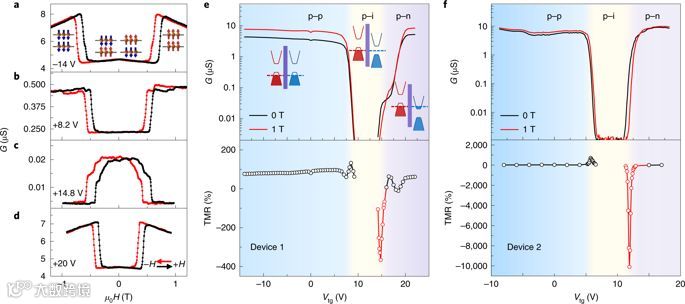 康奈尔大学Jie Shan 和 Kin Fai Mak课题组报道了基于双门控石墨烯/CrI3/石墨烯隧道结的自旋隧道场效应晶体管(TFET)。这些器件具有双极性能和隧道电导,这取决于CrI3隧道势垒中的磁性顺序。栅极电压在自旋翻转转变附近的恒定磁偏置下在层间反铁磁和铁磁状态之间切换隧道势垒,从而在具有大滞后的低电导状态和高电导状态之间有效且可逆地改变器件。通过电控制磁化配置而不是自旋电流,改自旋TFET实现了接近400%的高-低电导率(high–low conductance),这表明其在非易失性存储器应用的开发中具有价值。
